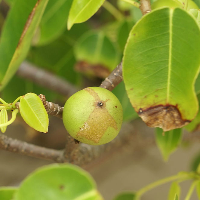 毒番石榴,又名馬瘋大戟木,是大戟科烏桕族的喬木植物,2011年被吉尼斯世界紀錄評為“世界上最危險的樹”。這種樹原生于美國佛羅里達州、巴哈馬群島、加勒比海、中美洲和南美洲北部的熱帶地區(qū),常生長在海灘沙地。由于其果實和葉子與蘋果相似,故也稱為“海灘蘋果”。 毒番石榴樹的所有部分均含有強烈的毒性。其乳白色的樹液含有佛波醇等物質(zhì),能引起強烈的過敏性接觸性皮炎。雨水觸碰樹液后,即使是微量的接觸也可能導致皮膚起水泡。樹液還能損壞汽車油漆。燃燒其樹木產(chǎn)生的煙霧若接觸眼睛,可能引起嚴重傷害。直接接觸樹液會引發(fā)大皰性皮炎、急性角膜結(jié)膜炎,甚至可能導致角膜上皮損傷。